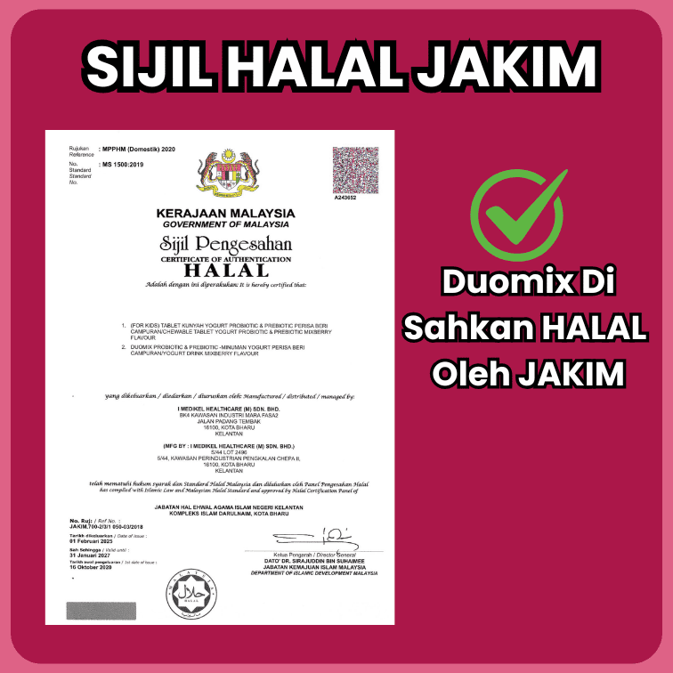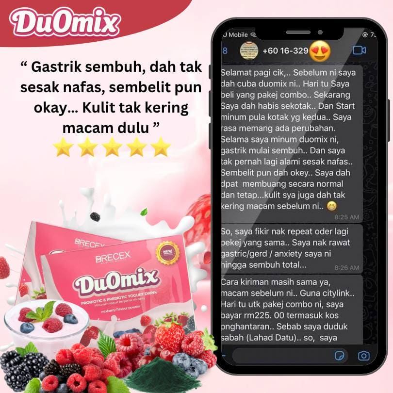 Duomix ialah campuran probiotik + prebiotik + spirulina + yogurt + mixberry yang dirumus khas untuk bantu masalah gastrik, GERD, perut kembung, reflux, anxiety (akibat perut), sembelit & pencernaan lemah.